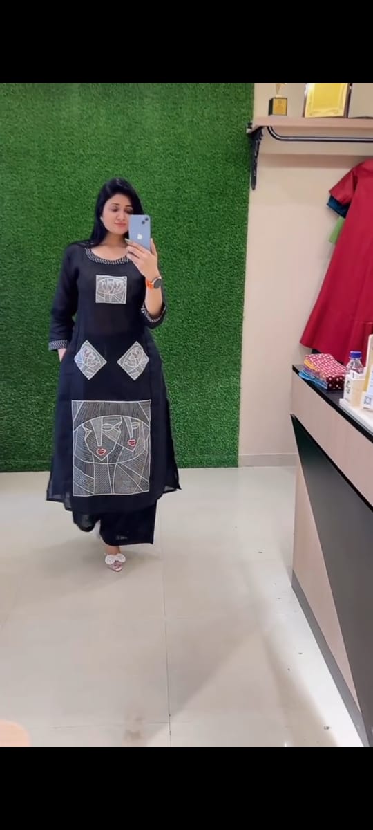 The long kurti showcases striking abstract and geometric embroidered panels, beautifully contrasted with sleek detailing on the neckline and sleeves. Paired with matching palazzo pants for a coordinated and contemporary look, this set effortlessly blends modern artistry with timeless grace.